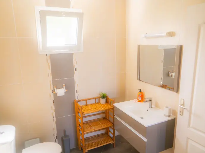 • d’une cuisine tout équipée : table et chaises en teck, plaque 4 feux, autocuiseur, réfrigérateur/congélateur, four et four micro-ondes, cafetière, vaisselle